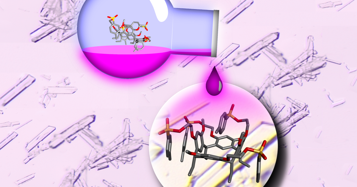 Cup-shaped resorcinarenes are macrocyclic molecules composed of aromatic hydrocarbons. They form in similar reactions as synthetic phenol resins, which are familiar from wood processing. These compounds are studied in supramolecular chemistry as host molecules, which can bind positively charged metal cations, ammonium ions or neutral guest molecules, such as toluene, inside their cavity by weak chemical interactions.