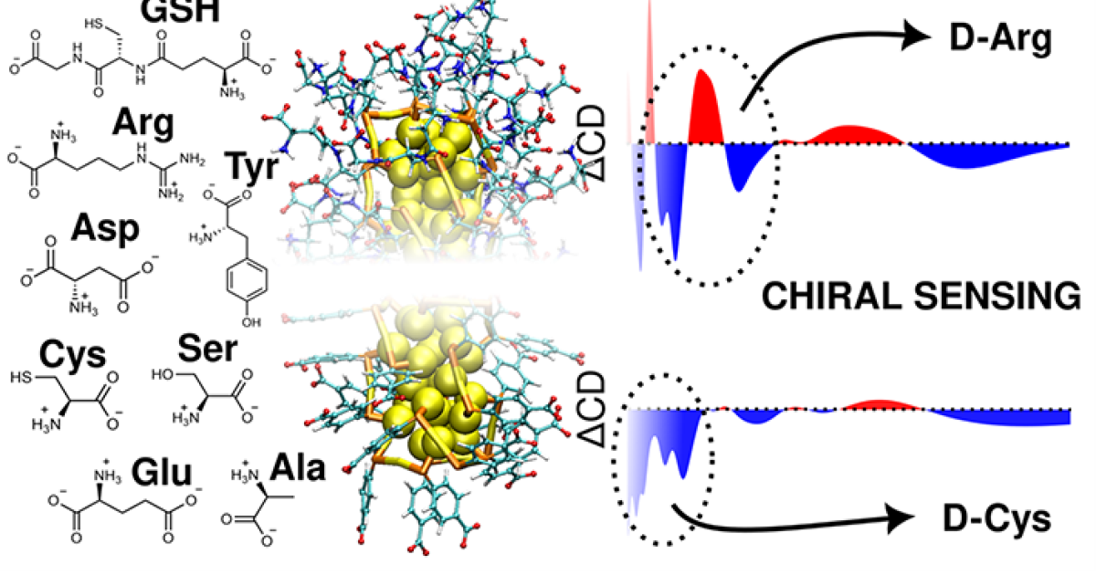 The outer surface of gold clusters is often helical, or chiral, just like spiral staircases or the helical structure of DNA. Therefore, they can be expected to bind chiral biomolecules in the environment (such as amino acids or DNA) in different ways, depending on both the chemical structure of the molecules and the direction of the cluster's helix.