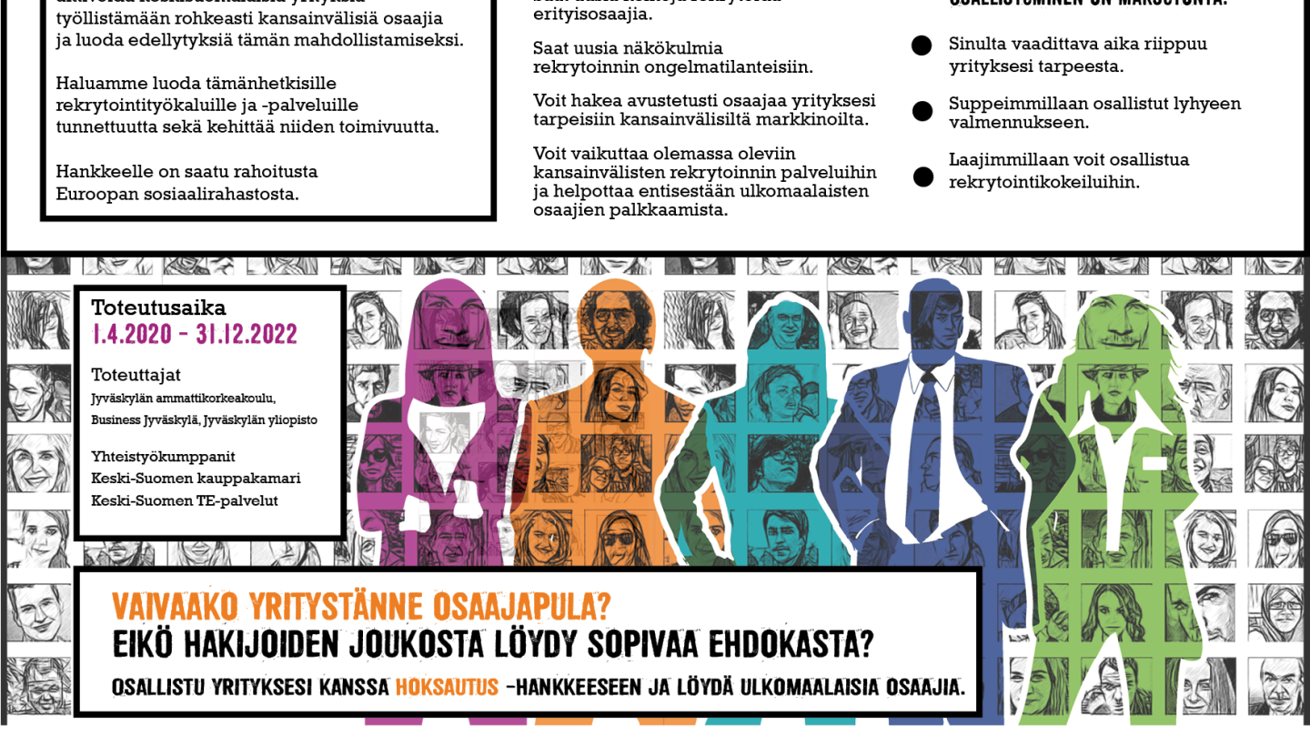 The aim of the REALIZE–project is to activate and coach employers in Central Finland in the recruitment of international talent. REALIZE seeks to promote and develop recruiting tools and practices related to international professionals and experts' employment. REALIZE is a joint project of Jyväskylä University of Applied Sciences, University of Jyväskylä, and Business Jyväskylä in co-operation with Central Finland Chamber of commerce and Central Finland TE-services. The project is implemented 1.4.2020 - 31.12.2022 with the funding of the European Social Fund.