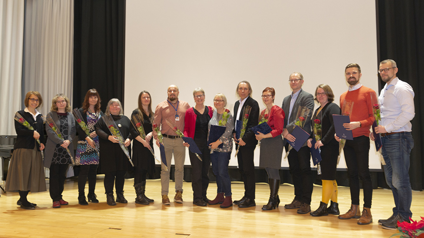 The awards were handed to the development group of the Cultures, Communities and Change degree programme (Kulttuurit ja yhteisöt muuttuvassa maailmassa, KUMU): Outi Fingerroos, Minna Mäkinen, Laura Stark and Jukka Jouhki from the Department of History and Ethnology and Miikka Pyykkönen, Karina Horsti and Kaisu Kumpulainen from the Department of Social Sciences and Philosophy and Sanna Vierimaa from the Faculty of Humanities and Social Sciences. The justification highlighted, for example, the programme’s closeness to the world of work and focus on learning project work.