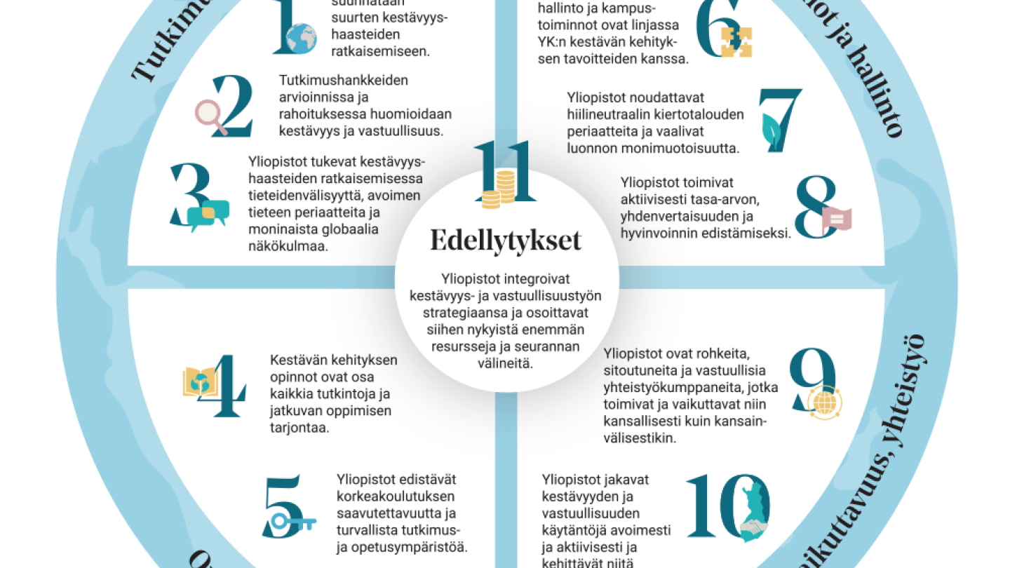 Carbon neutrality by 2030, sustainable development at the heart of strategies, and strong support for the Finnish Government's climate and biodiversity goals. All of the above is included in the plans of Finnish universities through mutual theses on sustainable development and responsibility, which have been published today.