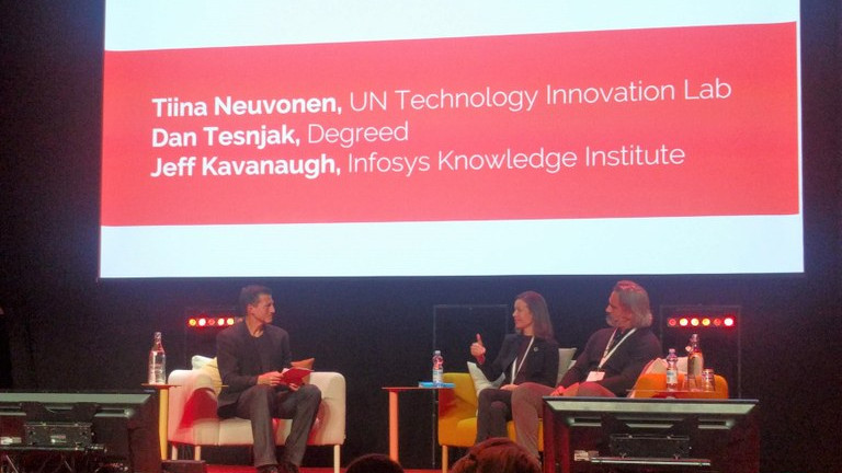 Tiina Neuvonen, YK:n Technology Innovation Labista ja Dan Tesnjak Degreed EMEA:sta keskustelivat Jeff Kavanaughin johdolla osaamisen kriisistä takkatulen äärellä, joskin ilman tulta. Mieleen tästä keskustelusta jäivät erityisesti oppimisen yksilölähtöisyyden korostuminen tulevaisuudessa.