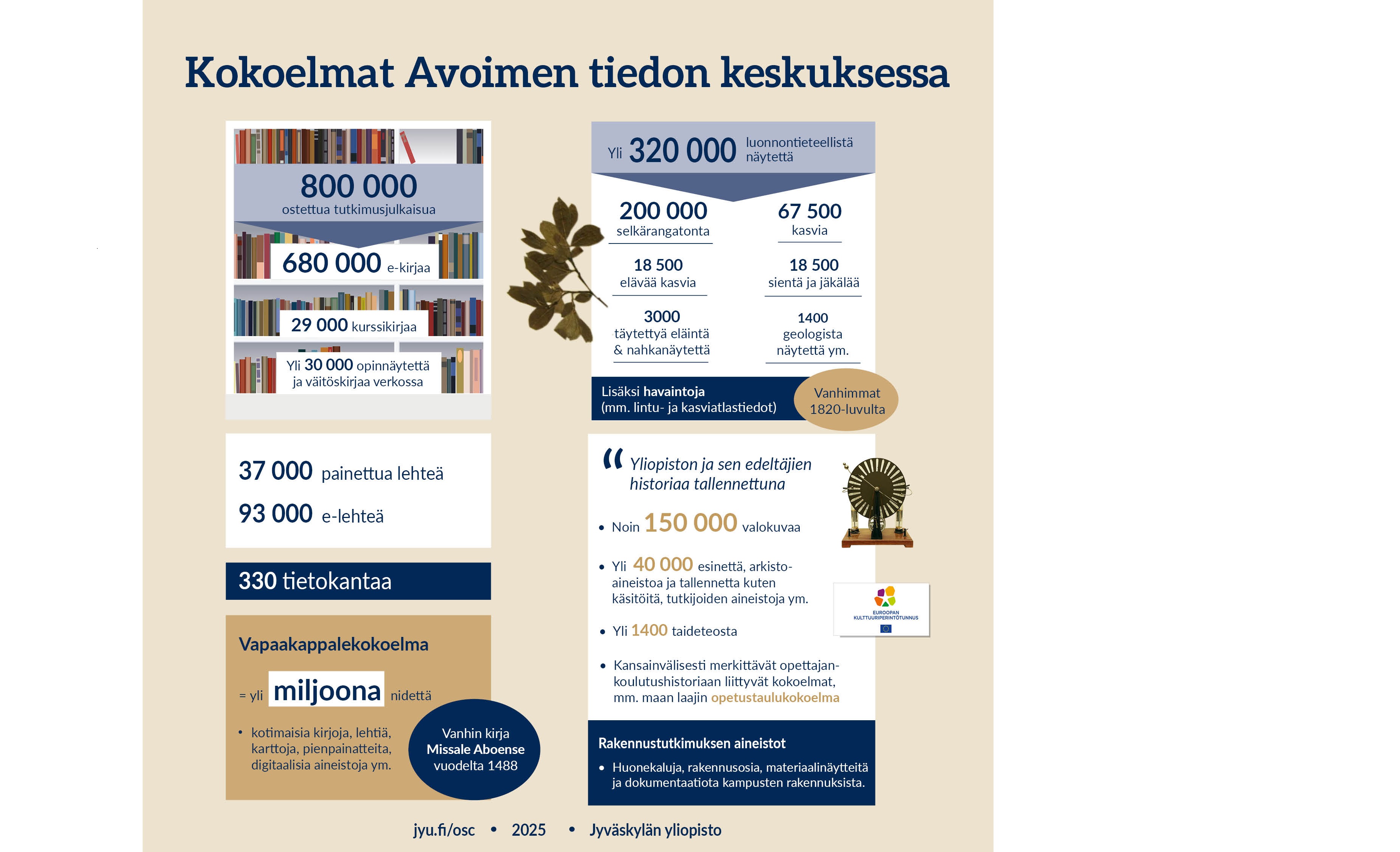 Avoimen tiedon keskuksen kokoelmat muodostavat monipuolisen ja elävän tiedon aarreaitan, joka palvelee niin tutkimusta, opetusta, opiskelua kuin yhteiskuntaa laajemminkin. Kokoelmat kattavat sekä digitaalisia että fyysisiä aineistoja, ja ne ovat kaikkien saavutettavissa avoimuuden periaatteiden mukaisesti. Kokoelmia hallinnoivat Jyväskylän yliopiston kirjasto ja Tiedemuseo.