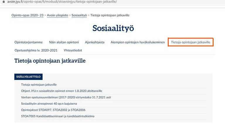 Oppiainekohtaiset ohjeet löydät avoimen yliopiston opinto-oppaasta Tietoja opintojaan jatkaville -välilehdeltä. Esimerkkinä sosiaalityön välilehti. Tarvittaessa lisätietoja saat oppiaineen yhteyshenkilöiltä.