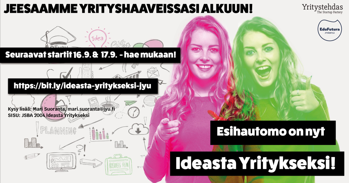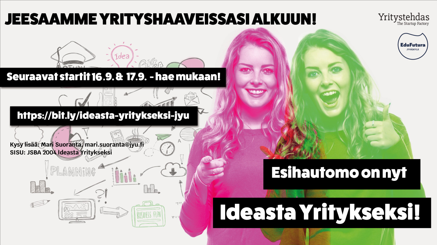 Haaveiletko yrittäjyydestä tai tiedätkö jonkun, jolla on idea, mutta joka ei ole uskaltanut vielä perustaa yritystä tai lähteä selvittämään idean bisnespotentiaalia? Ideasta Yritykseksi-valmennuksessa (ent. Oppilaitosesihautomo) valmentajatiimi auttaa kehittämään liikeideaa konkreettisin askelin kohti yrityksen perustamista. Samalla valmentajatiimi auttaa ymmärtämään yritystoimintaa, sen mahdollisuuksia ja vaatimuksia. Valmennuksesta saa 5 opintopistettä / 15 osaamispistettä oppilaitoksesta riippuen. Maksuttomaan valmennukseen voivat osallistua JAMKin, Jyväskylän yliopiston sekä Gradian opiskelijat, tutkijat ja henkilökunnan jäsenet.