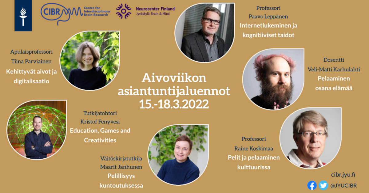 Jyväskylän yliopiston aivoviikon kattaukseen kuuluvat myös videoluennot. Tämän vuoden teemana on ”Pelaavat aivot”. Videoluennot julkaistaan 15.–18.3. Aivoviikon tapahtumasivulla. Luennot ovat katsottavissa myös tapahtumaviikon jälkeen.