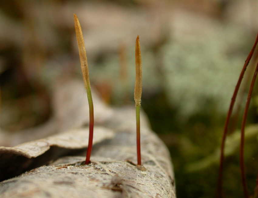 Karhunsammal puskee keväällä itiöpesäkkeitään kuolleiden lehtien läpi.